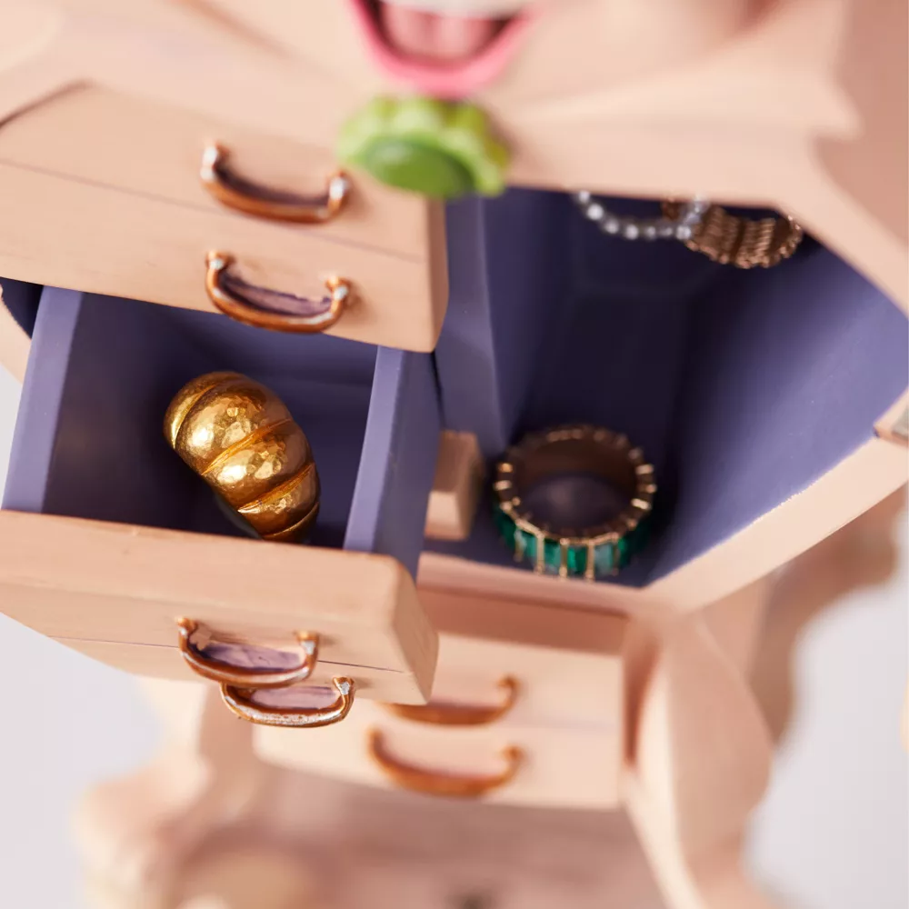 Cachez vos trésors dans cette jolie boîte à bijoux. Inspirée de la garde-robe dans La Garde-robe, elle comporte trois tiroirs et une étagère ouverte avec trois crochets.