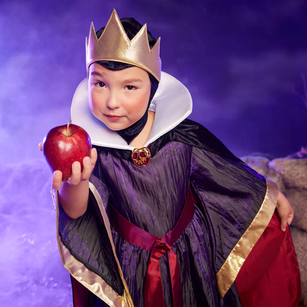 Déguisez votre petit monstre en méchante sorcière avec ce costume emblématique de La Reine ! Cet ensemble 4 pièces comprend une robe sombre, une cape amovible, une couronne et une coiffe.