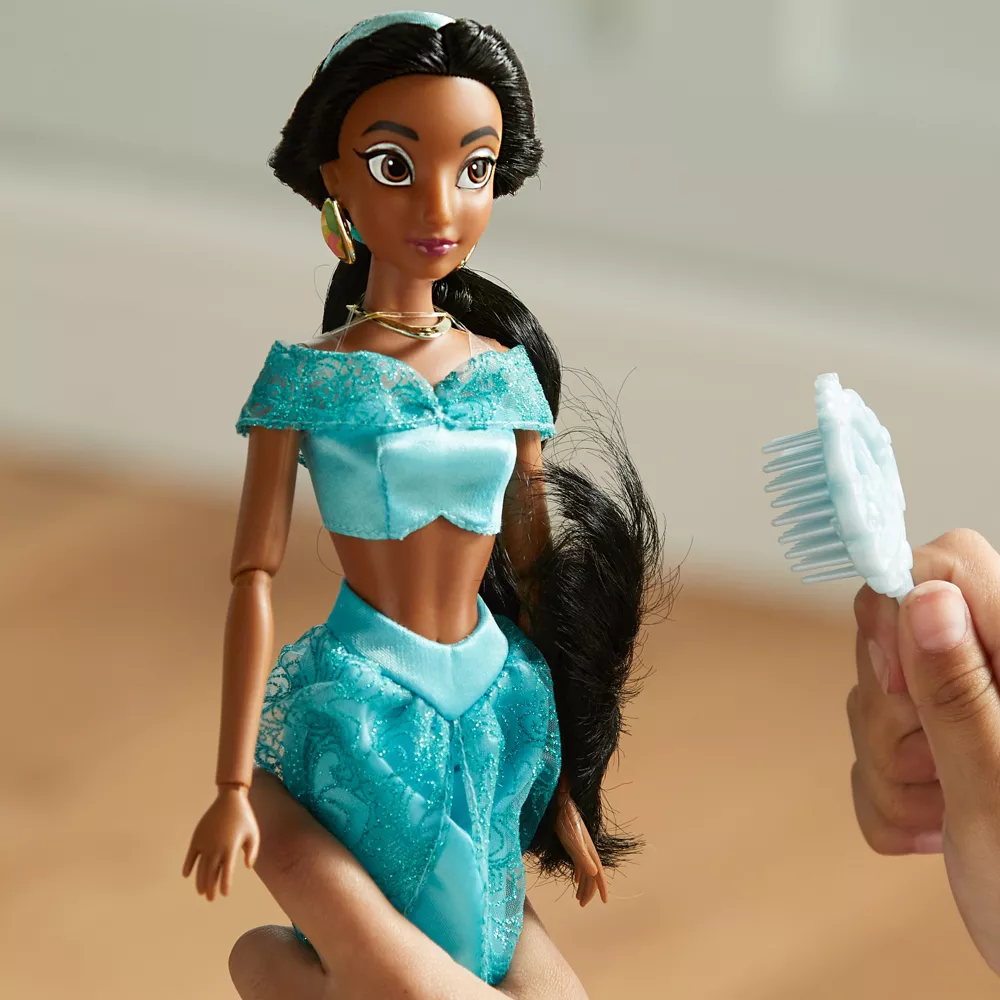 Une superbe chevelure noire, une tenue étincelante et des bijoux royaux… Comment ne pas tomber sous le charme de Jasmine ? Et pour couronner le tout, cette poupée articulée s’accompagne même d’une brosse !
